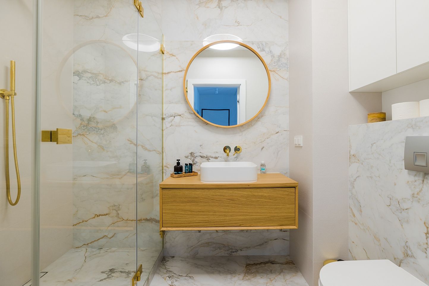 - Łazienka Modern Gold: Luksusowy salon kąpielowy z marmurem i złotą armaturą. Przestronny prysznic typu Walk-In, dębowe detale i nastrojowe oświetlenie LED tworzą atmosferę prywatnego SPA.