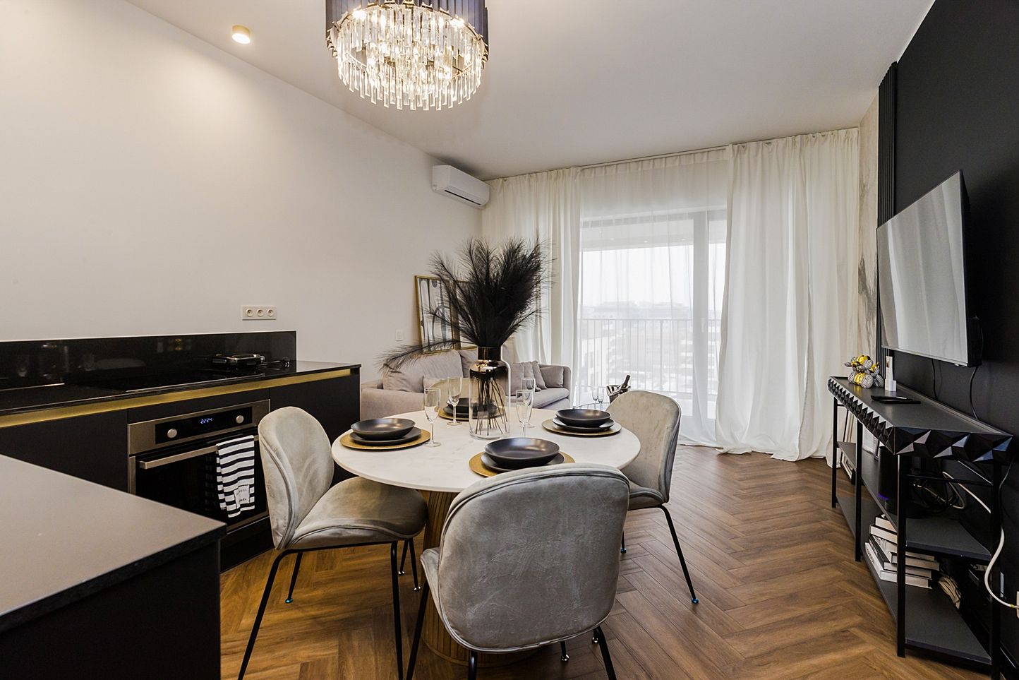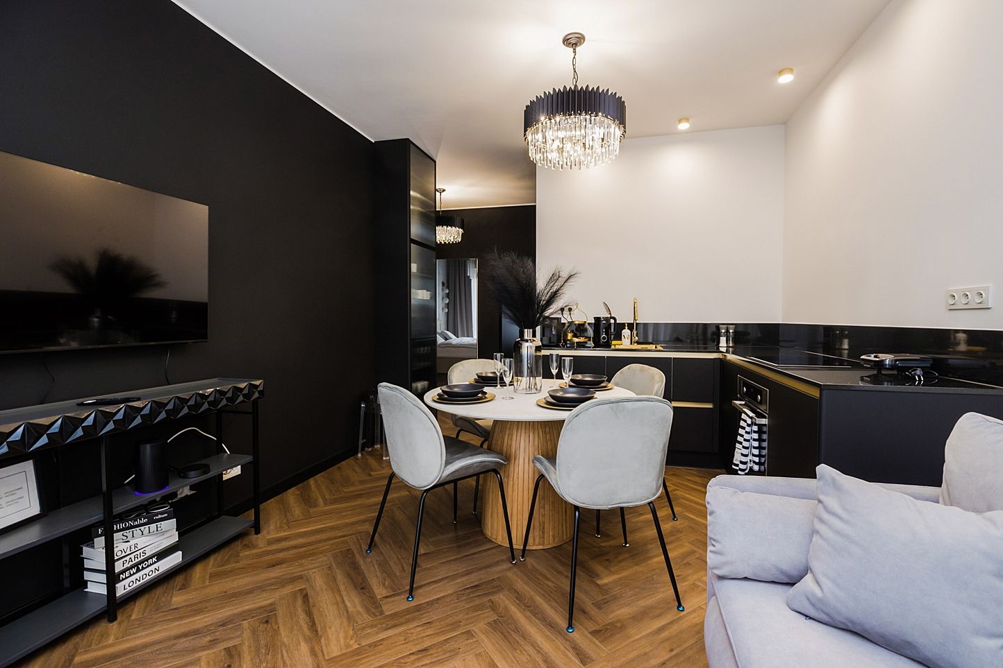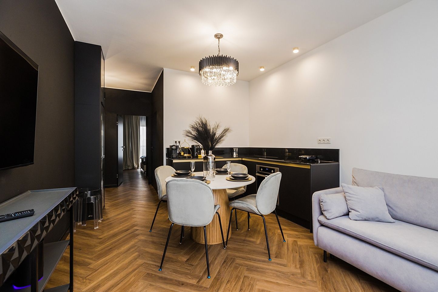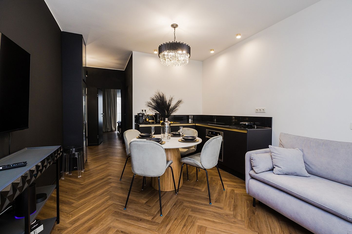 Otwarta strefa dzienna to serce apartamentu. Znajdziesz tu okrągły, marmurowy stół z aksamitnymi krzesłami pod kryształowym żyrandolem oraz czarną, minimalistyczną kuchnię ze złotymi akcentami. Strukturalna ściana multimedialna i dębowa jodełka na podłodze tworzą idealny balans między nowoczesnością a klasyką.