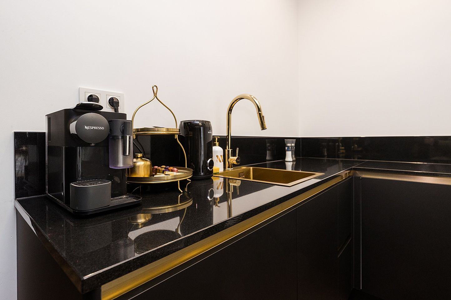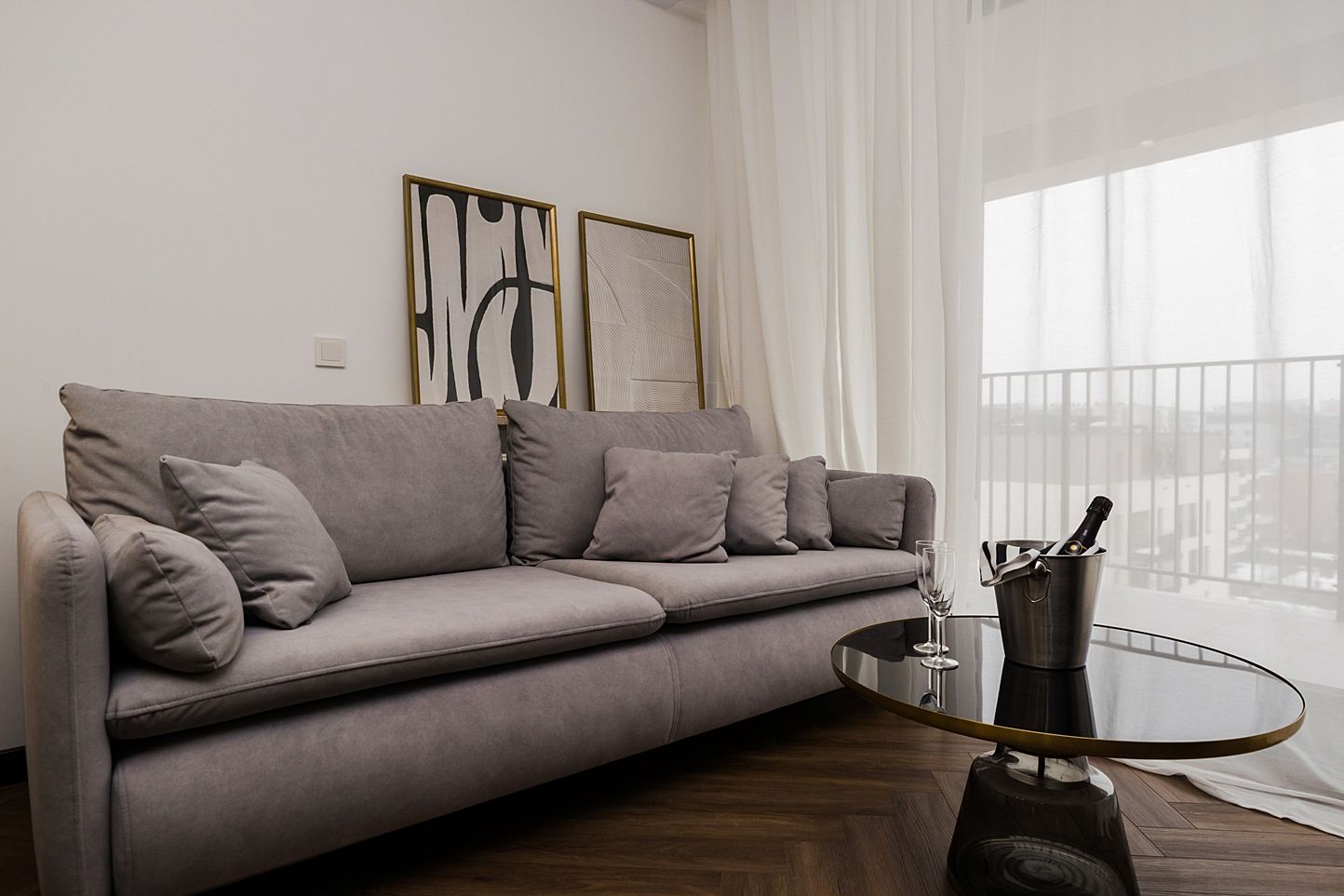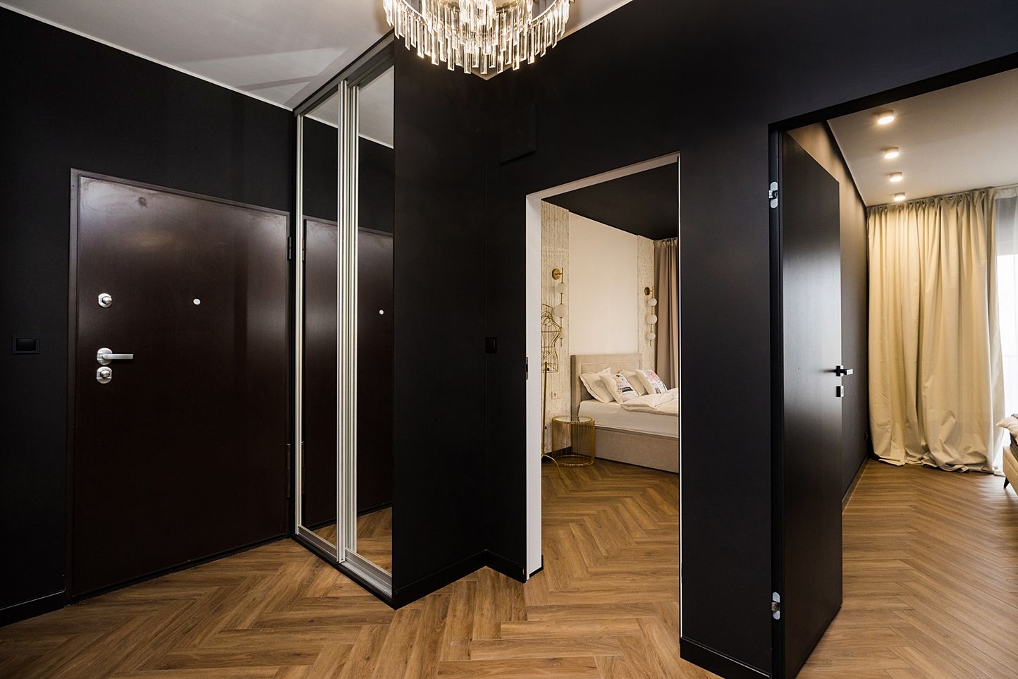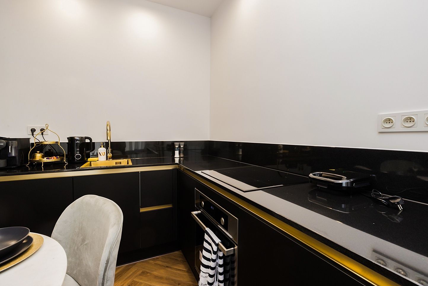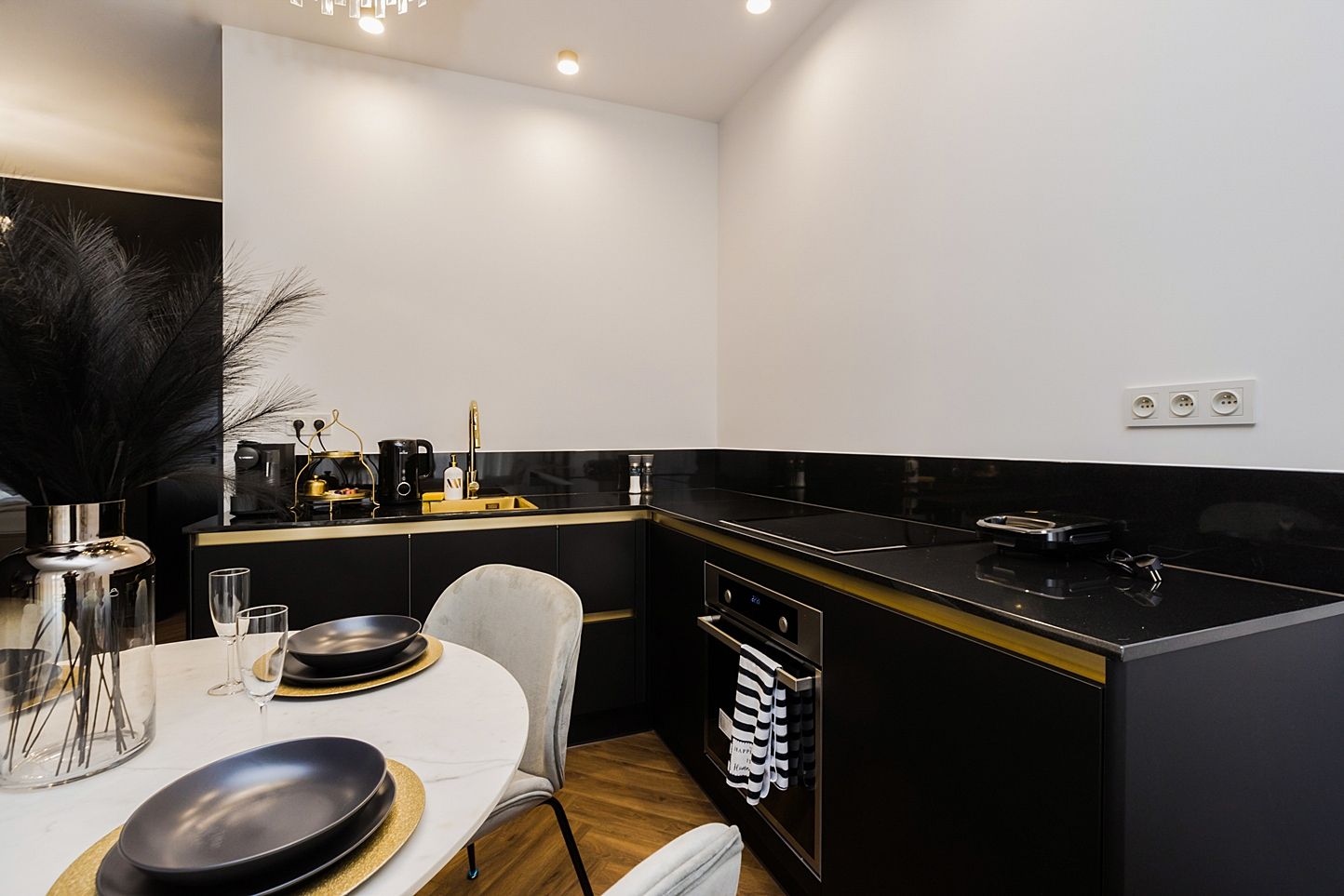 Otwarta strefa dzienna to serce apartamentu. Znajdziesz tu okrągły, marmurowy stół z aksamitnymi krzesłami pod kryształowym żyrandolem oraz czarną, minimalistyczną kuchnię ze złotymi akcentami. Strukturalna ściana multimedialna i dębowa jodełka na podłodze tworzą idealny balans między nowoczesnością a klasyką.