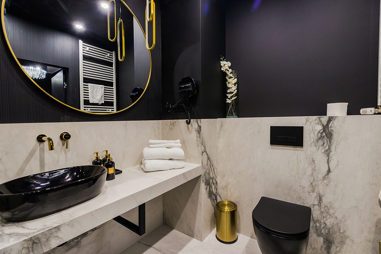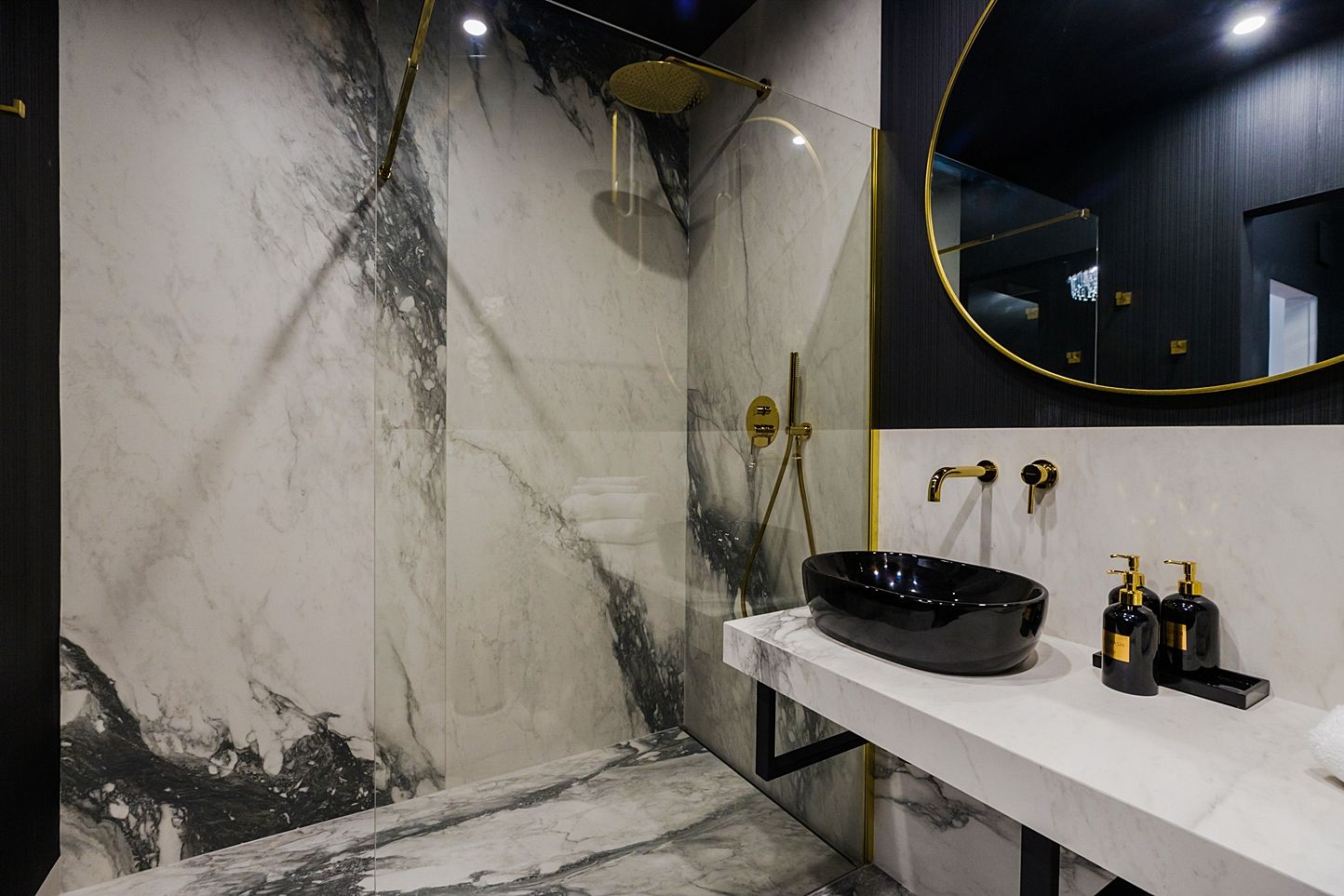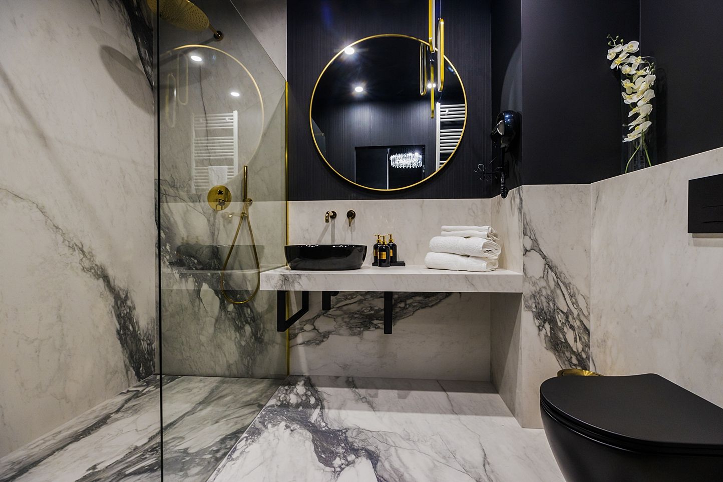 Spektakularny salon kąpielowy wykończony wielkoformatowym marmurem. Przestronny prysznic Walk-In ze złotą armaturą, czarna nablatowa umywalka i okrągłe, podświetlane lustro sprawią, że każda chwila tutaj będzie rytuałem luksusu.