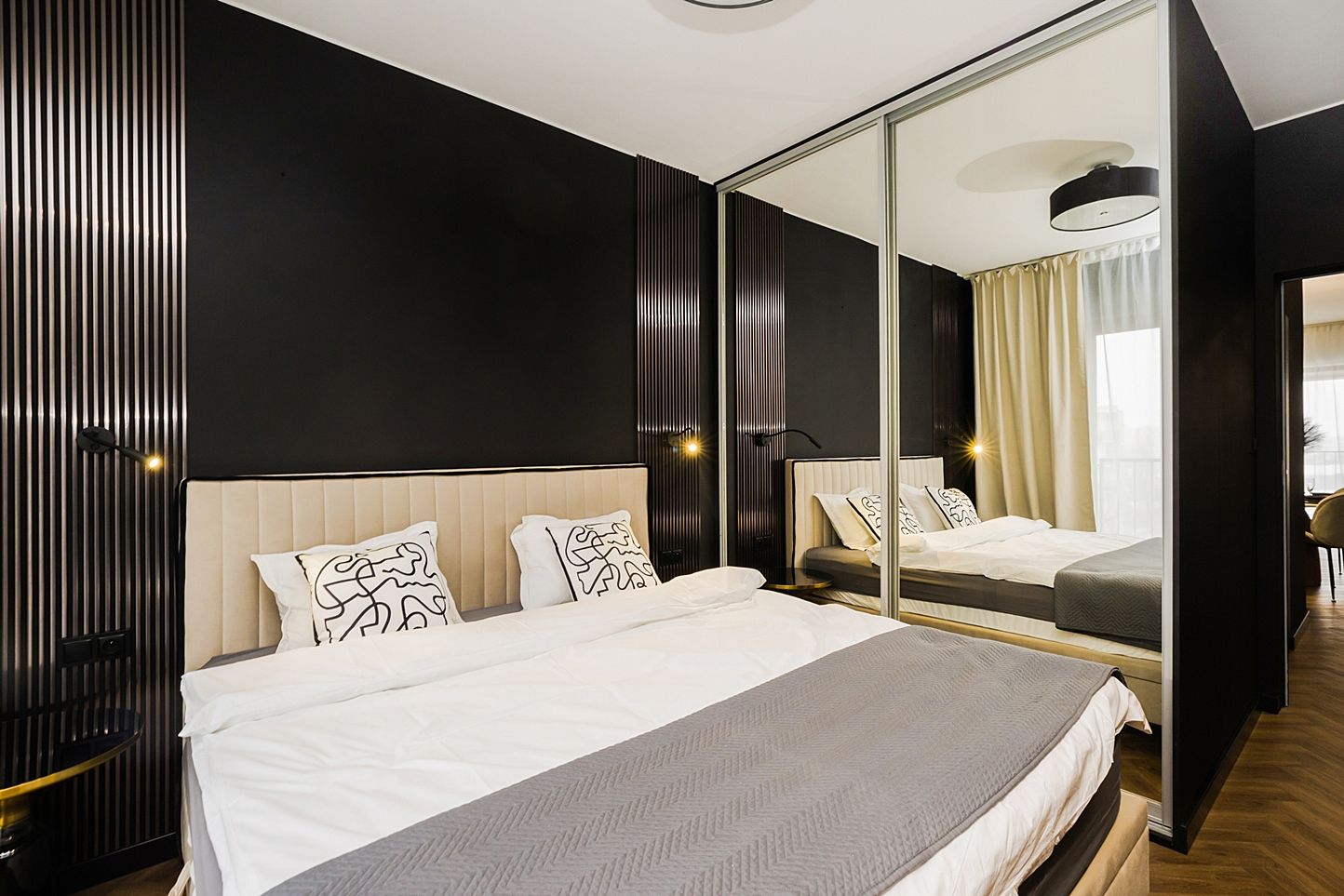 Zapraszamy do miejsca, które redefiniuje pojęcie nowoczesnej elegancji. Ten trzypokojowy apartament to prawdziwa perełka designu – połączenie głębokiej czerni, szlachetnego marmuru i złota tworzy przestrzeń, która zachwyca od pierwszego wejrzenia. To idealny wybór dla osób szukających noclegu z charakterem, w samym sercu metropolii.