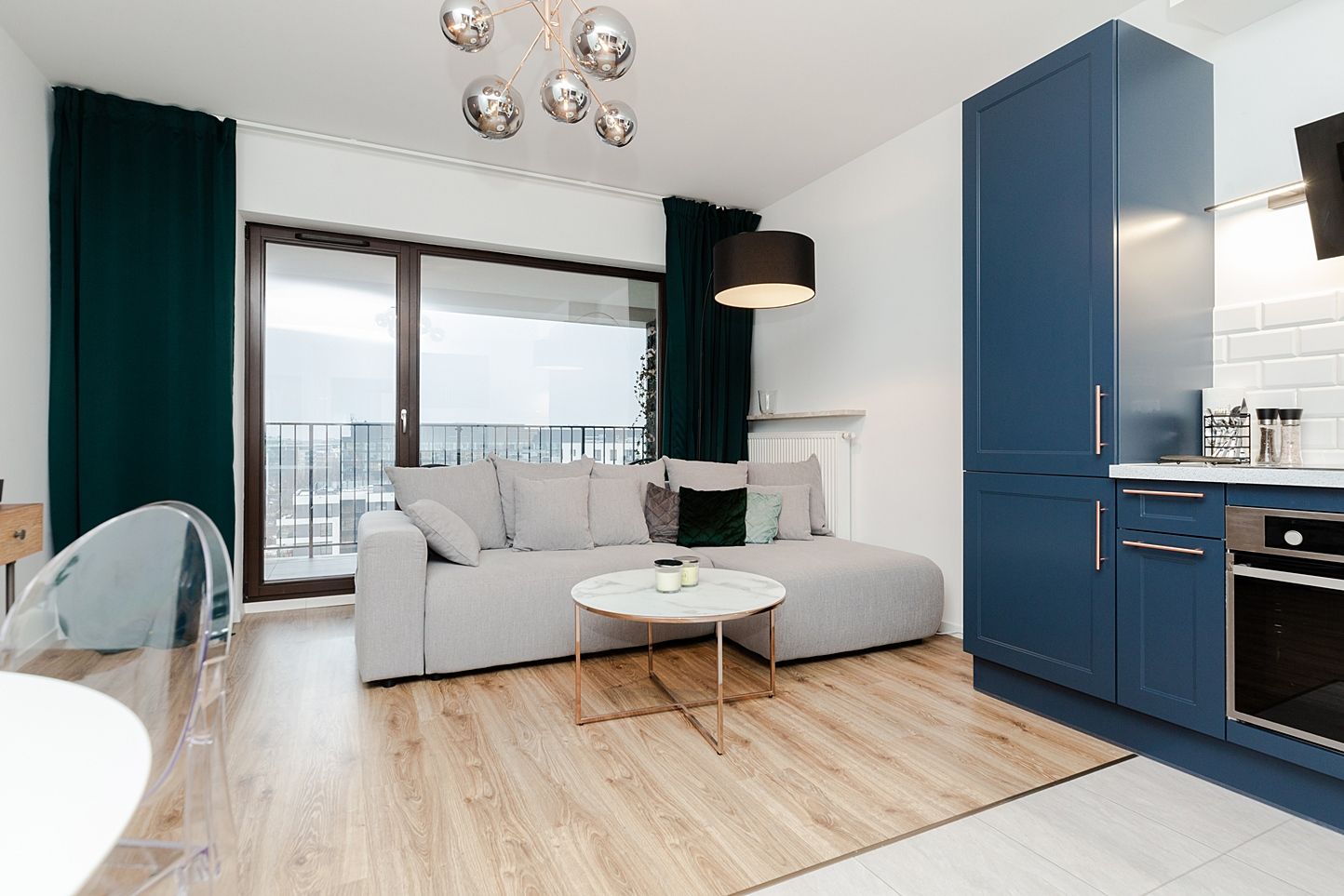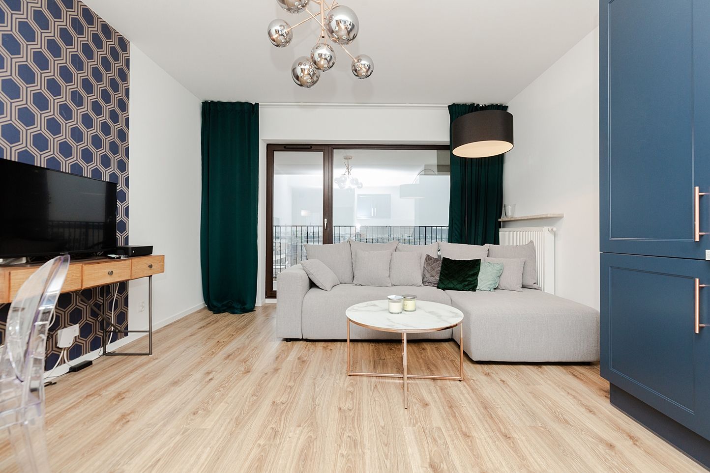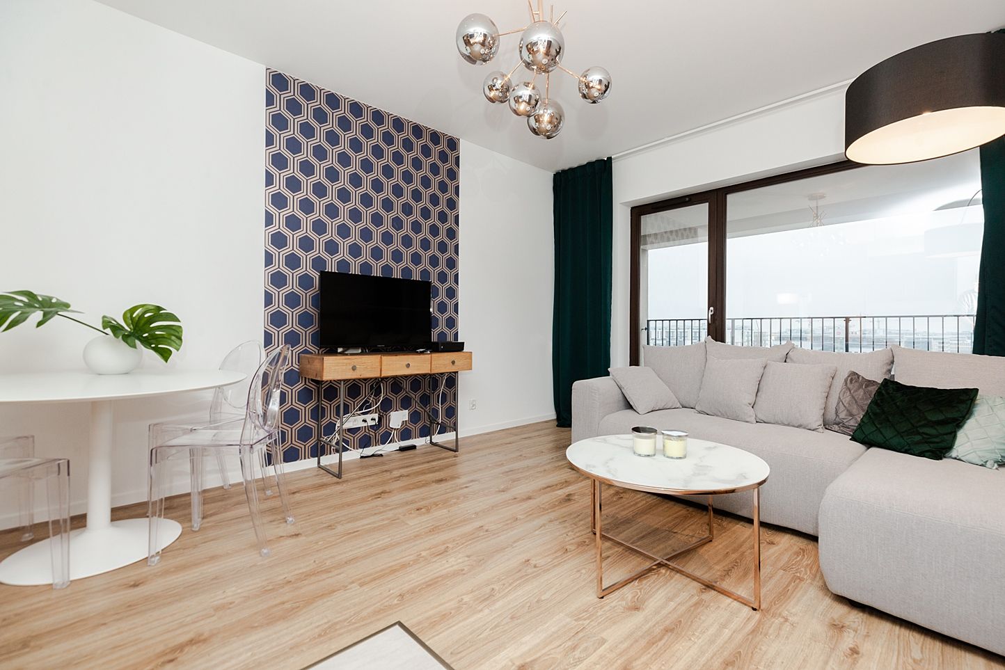 Otwarta strefa dzienna zachwyca kontrastem głębokiego granatu kuchni ze śnieżnobiałymi kafelkami. Duży, szary narożnik przy samym oknie balkonowym to idealne miejsce, by podziwiać panoramę miasta. Designerskie meble – marmurowy stolik i krzesła typu Ghost – nadają wnętrzu lekkości i nowoczesnego blasku.