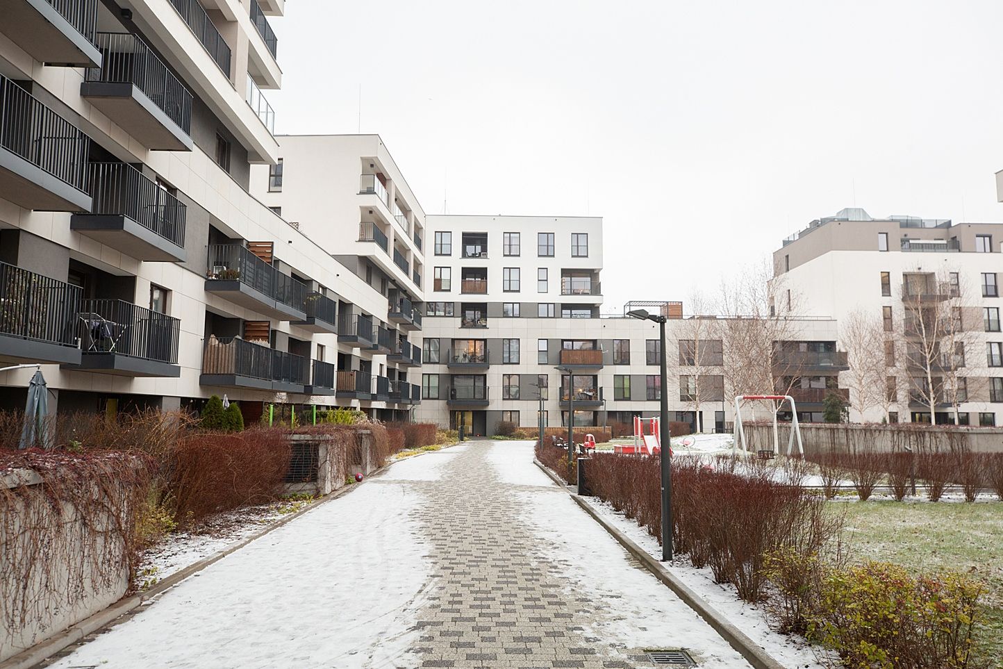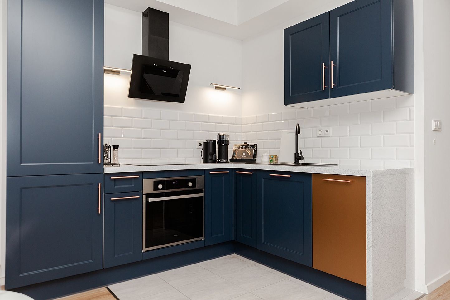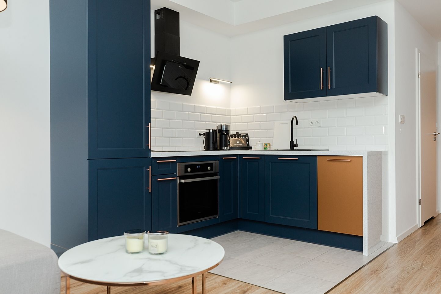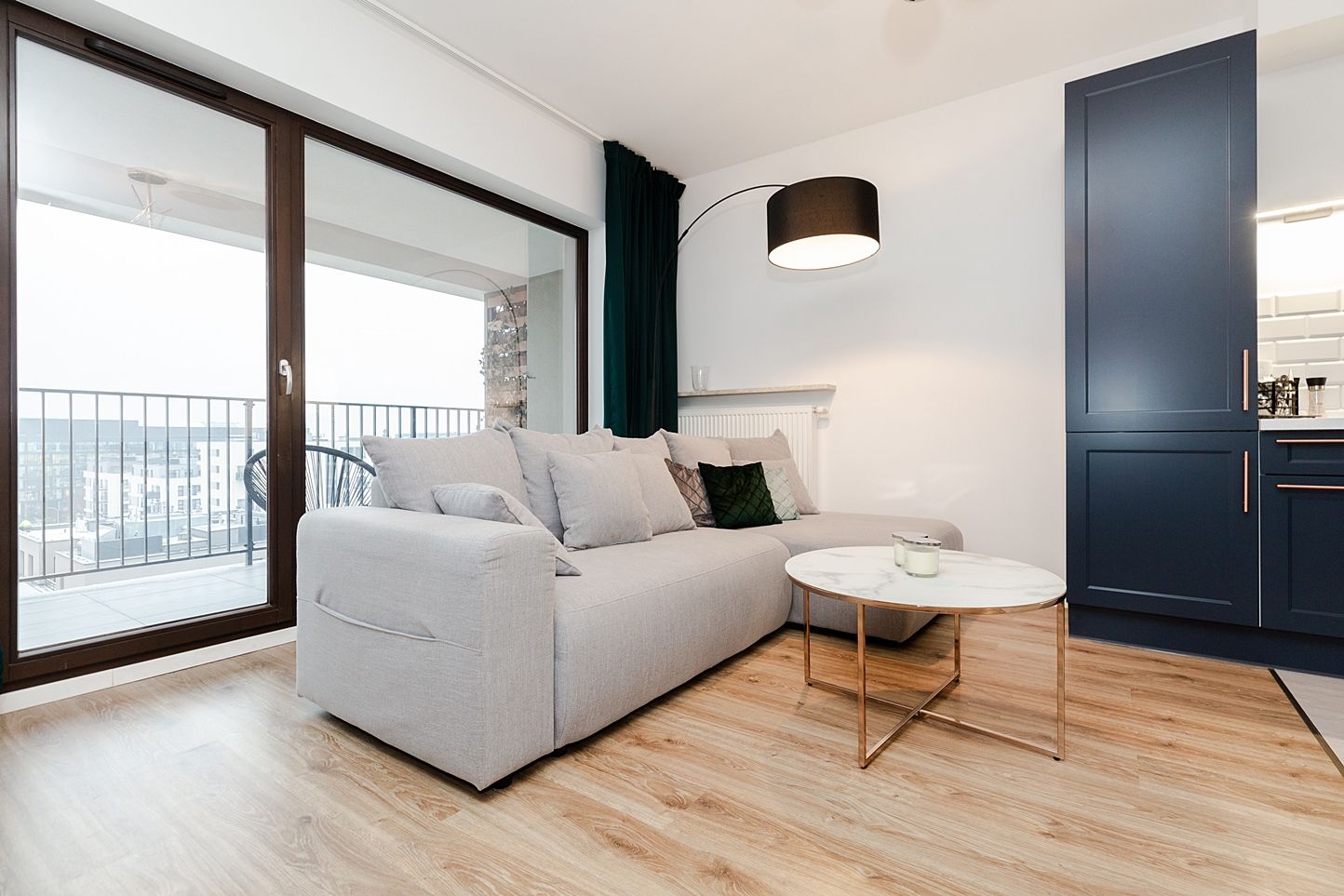 Otwarta strefa dzienna zachwyca kontrastem głębokiego granatu kuchni ze śnieżnobiałymi kafelkami. Duży, szary narożnik przy samym oknie balkonowym to idealne miejsce, by podziwiać panoramę miasta. Designerskie meble – marmurowy stolik i krzesła typu Ghost – nadają wnętrzu lekkości i nowoczesnego blasku.