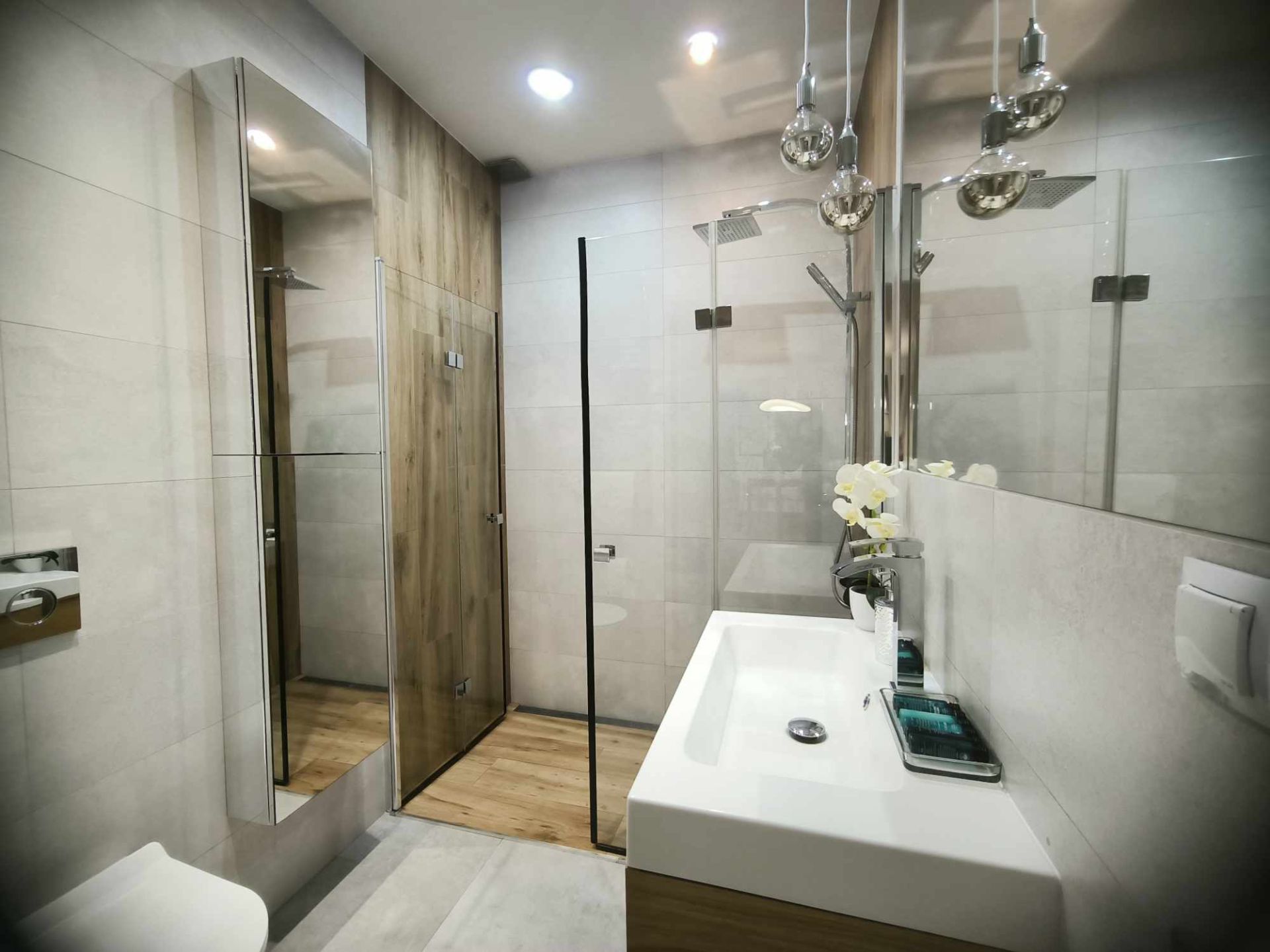 - Nowoczesna Łazienka z Prysznicem: W tym apartamencie do dyspozycji gości jest funkcjonalna łazienka wyposażona w komfortową kabinę prysznicową, idealną na szybkie odświeżenie w ciągu dnia.