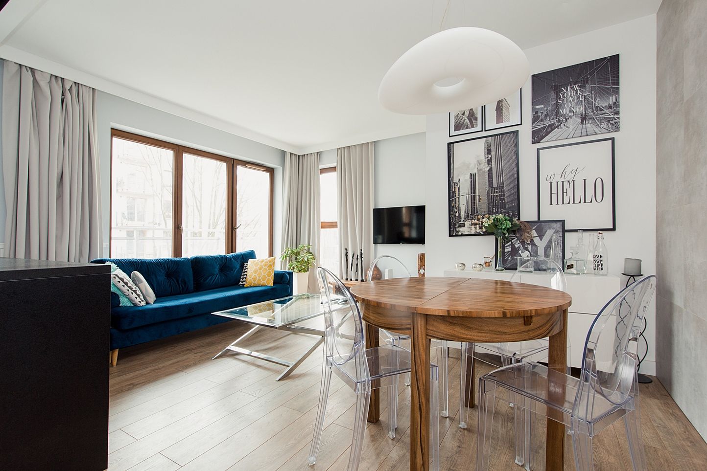 - Jadalnia z Designerskim Sznytem: Okrągły stół z transparentnymi krzesłami typu Ghost dodaje wnętrzu lekkości i elegancji, stanowiąc idealne miejsce do wspólnych posiłków.