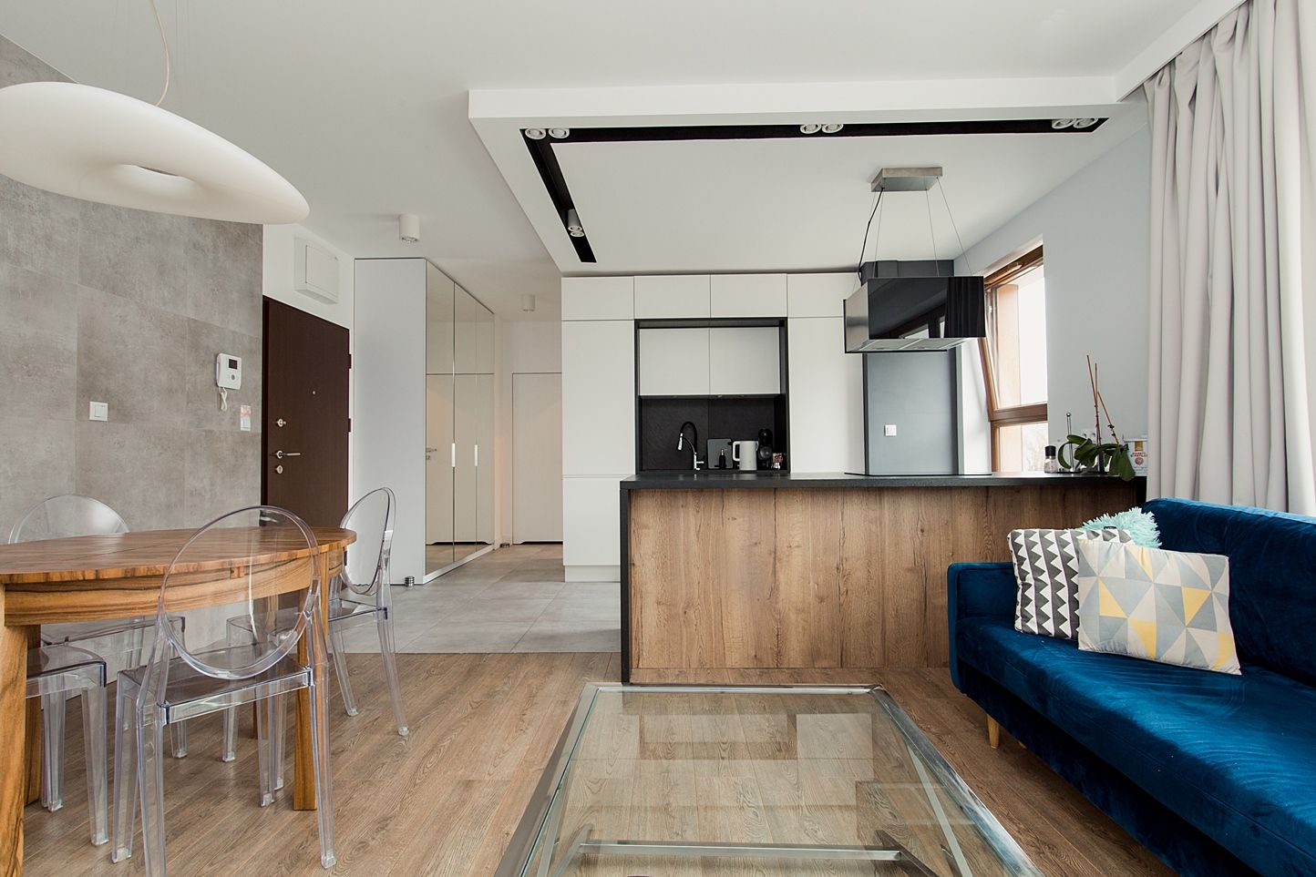 - Salon z Charakterem: Wygodna sofa w części wypoczynkowej oraz duży telewizor Smart TV tworzą idealną strefę rozrywki. Całość dopełnia oświetlenie nadające wnętrzu wielkomiejski sznyt.